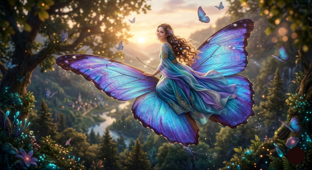 そこで彼は、蝶の羽に乗って導いてくれる一人の美しい女性に出会います。